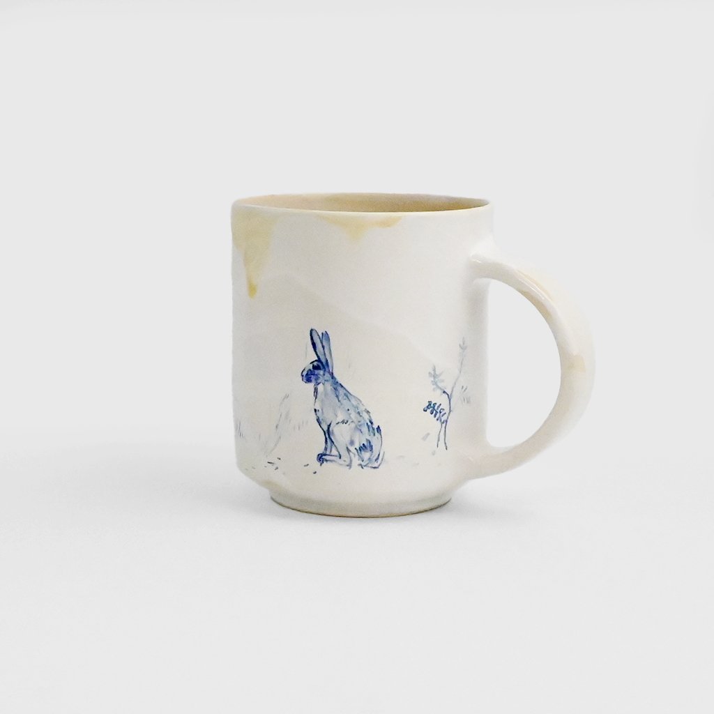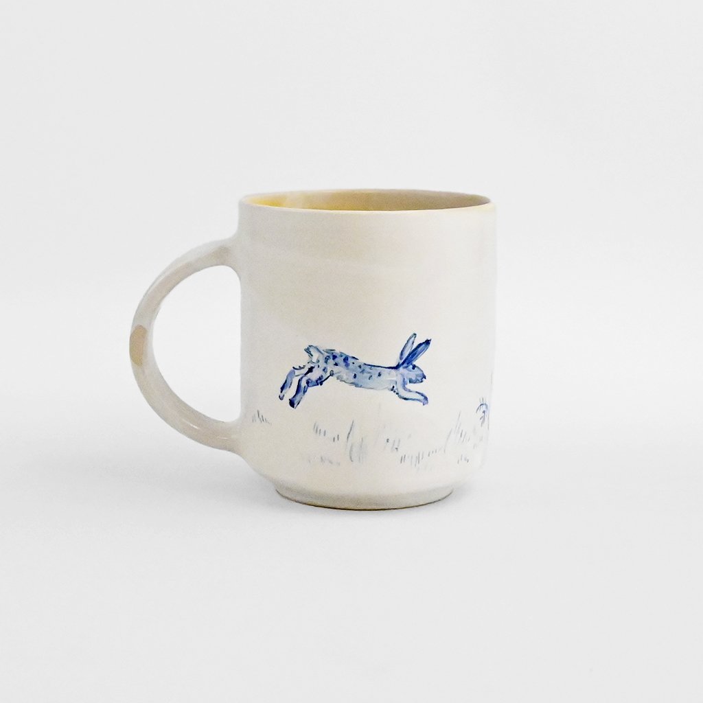 Ručne točený hrnček zo svetlej kameniny upravený kombináciou polomatnej krémovej a lesklej bielej glazúry. Modrý dekor je zdobený technikou majoliky do surovej bielej glazúry pred finálnym, druhým výpalom na 1240°C. Vďaka výpalu pri vysokej teplote je vhodný aj do umývačky riadu.