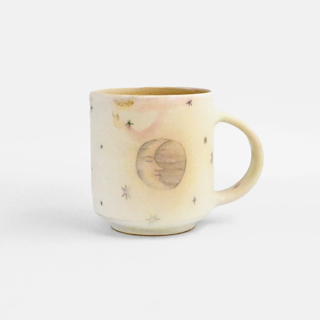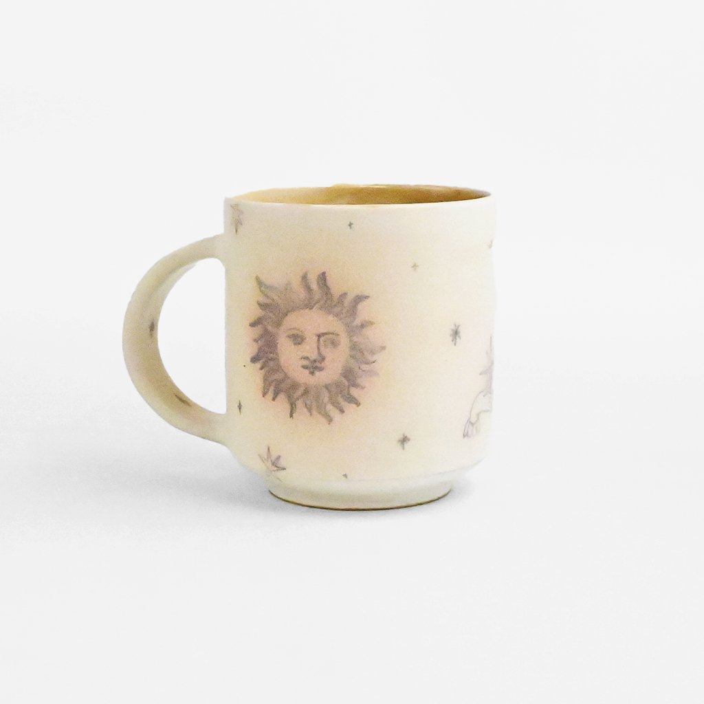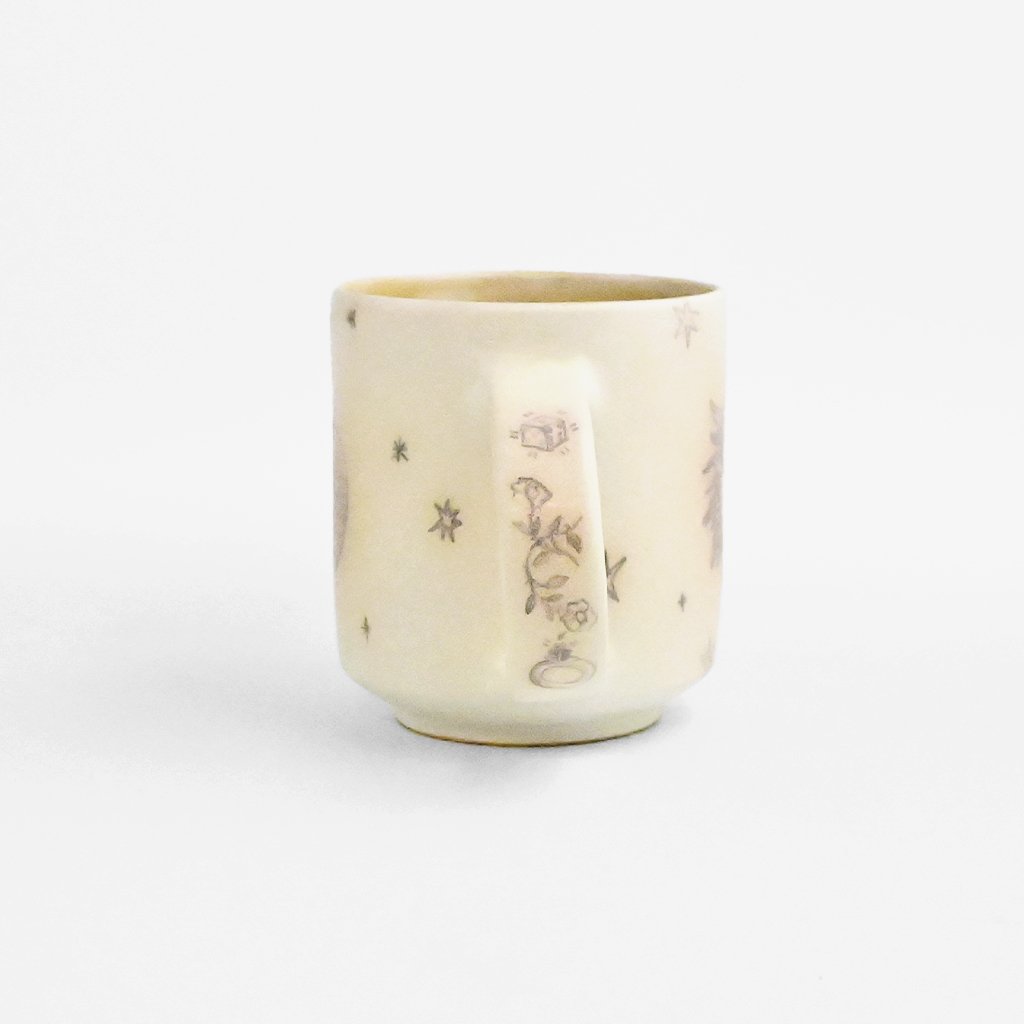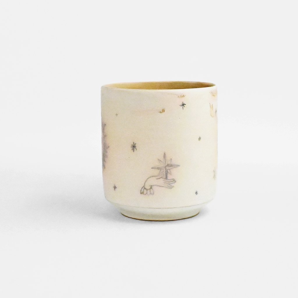 Ručne točený hrnček zo svetlej kameniny upravený kombináciou polomatnej krémovej a efektnej bielej glazúry. Modrý dekor je zdobený technikou majoliky do surovej glazúry pred finálnym, druhým výpalom na 1240°C. Vďaka výpalu pri vysokej teplote je vhodný aj do umývačky riadu.