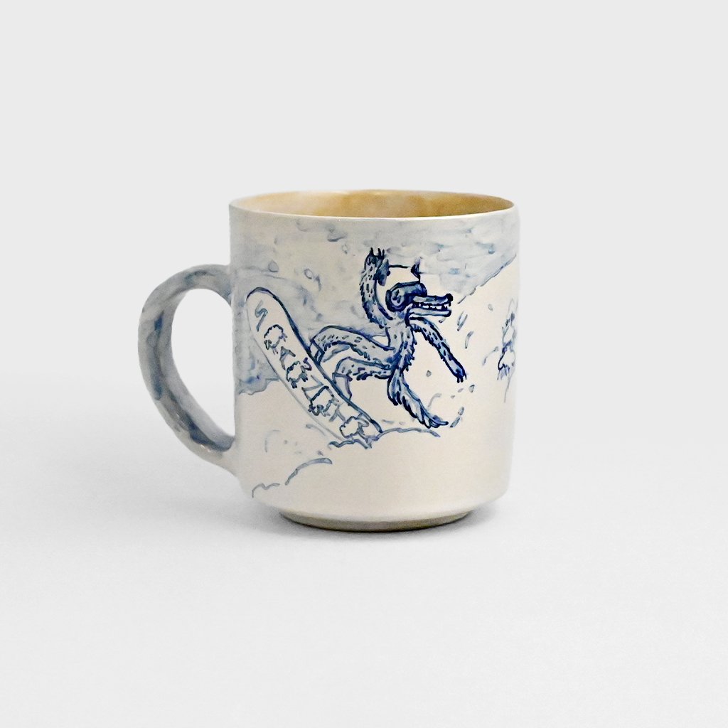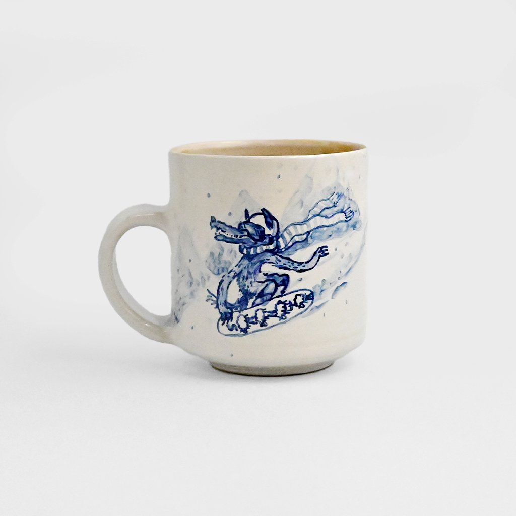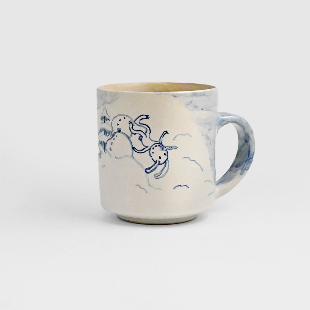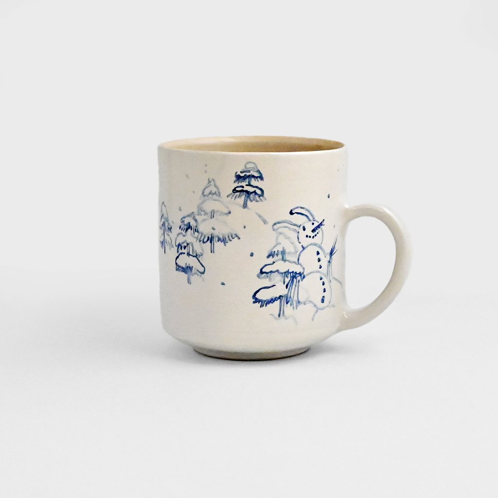 Ručne točený hrnček zo svetlej kameniny upravený kombináciou polomatnej krémovej a lesklej bielej glazúry. Modrý dekor je zdobený technikou majoliky do surovej bielej glazúry pred finálnym, druhým výpalom na 1240°C. Vďaka výpalu pri vysokej teplote je vhodný aj do umývačky riadu.