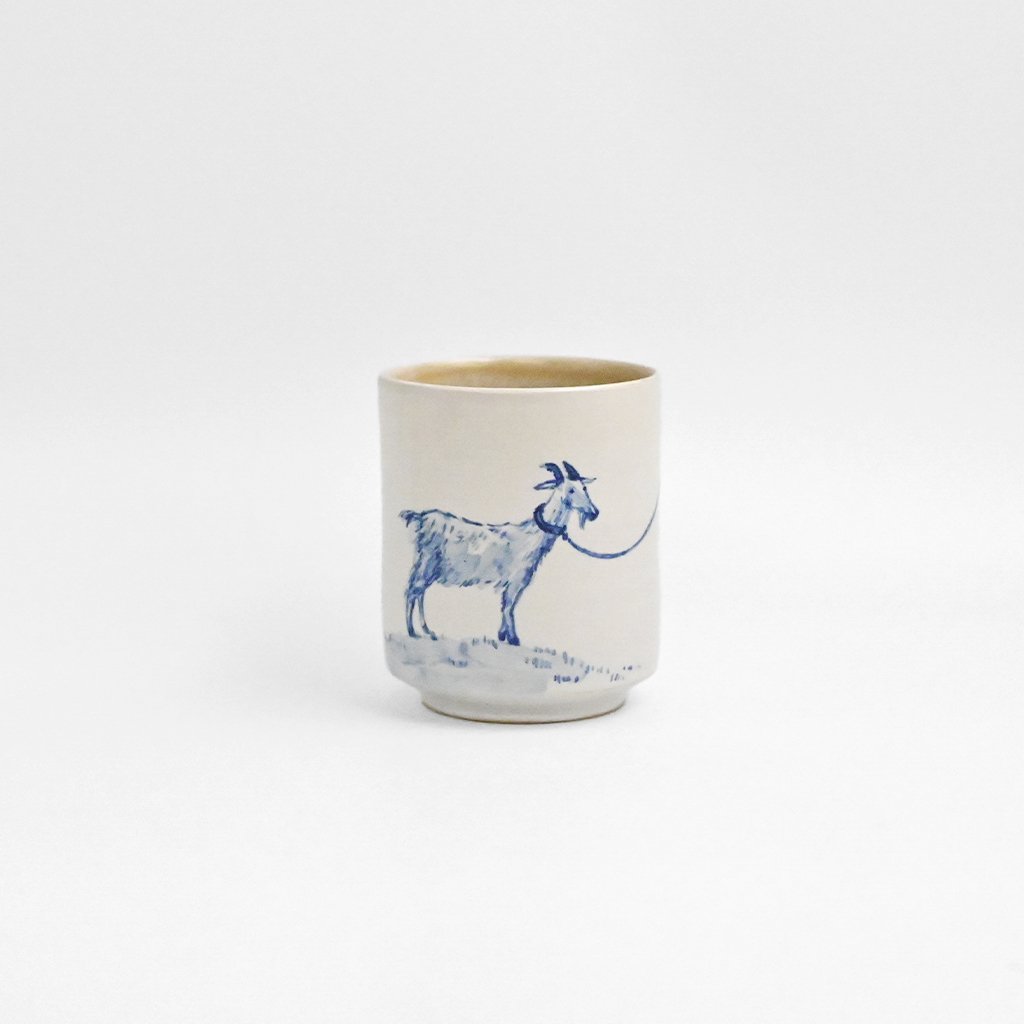 Ručne točená šálka bez uška zo svetlej kameniny upravená kombináciou polomatnej krémovej a lesklej bielej glazúry. Modrý dekor je zdobený technikou majoliky do surovej bielej glazúry pred finálnym, druhým výpalom na 1240°C. Vďaka výpalu pri vysokej teplote je vhodná aj do umývačky riadu.