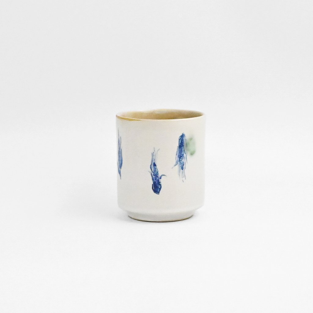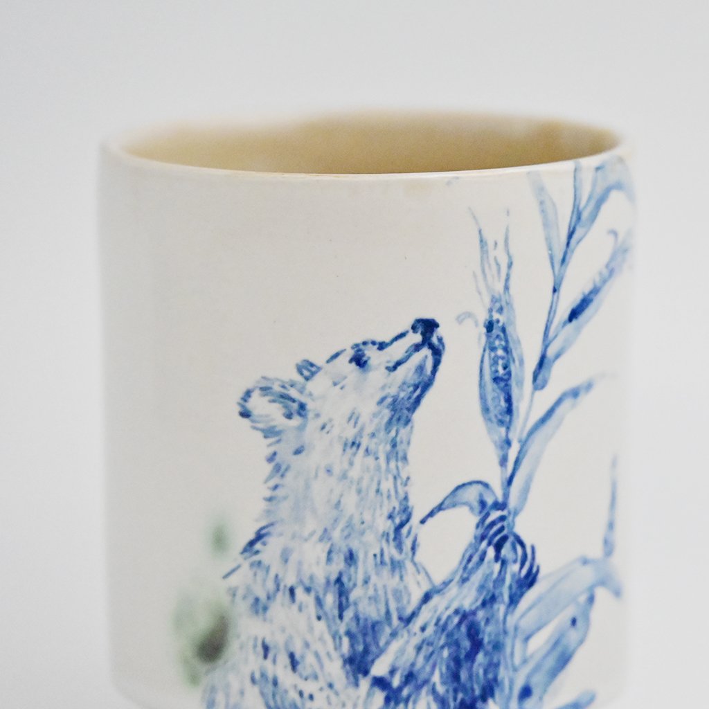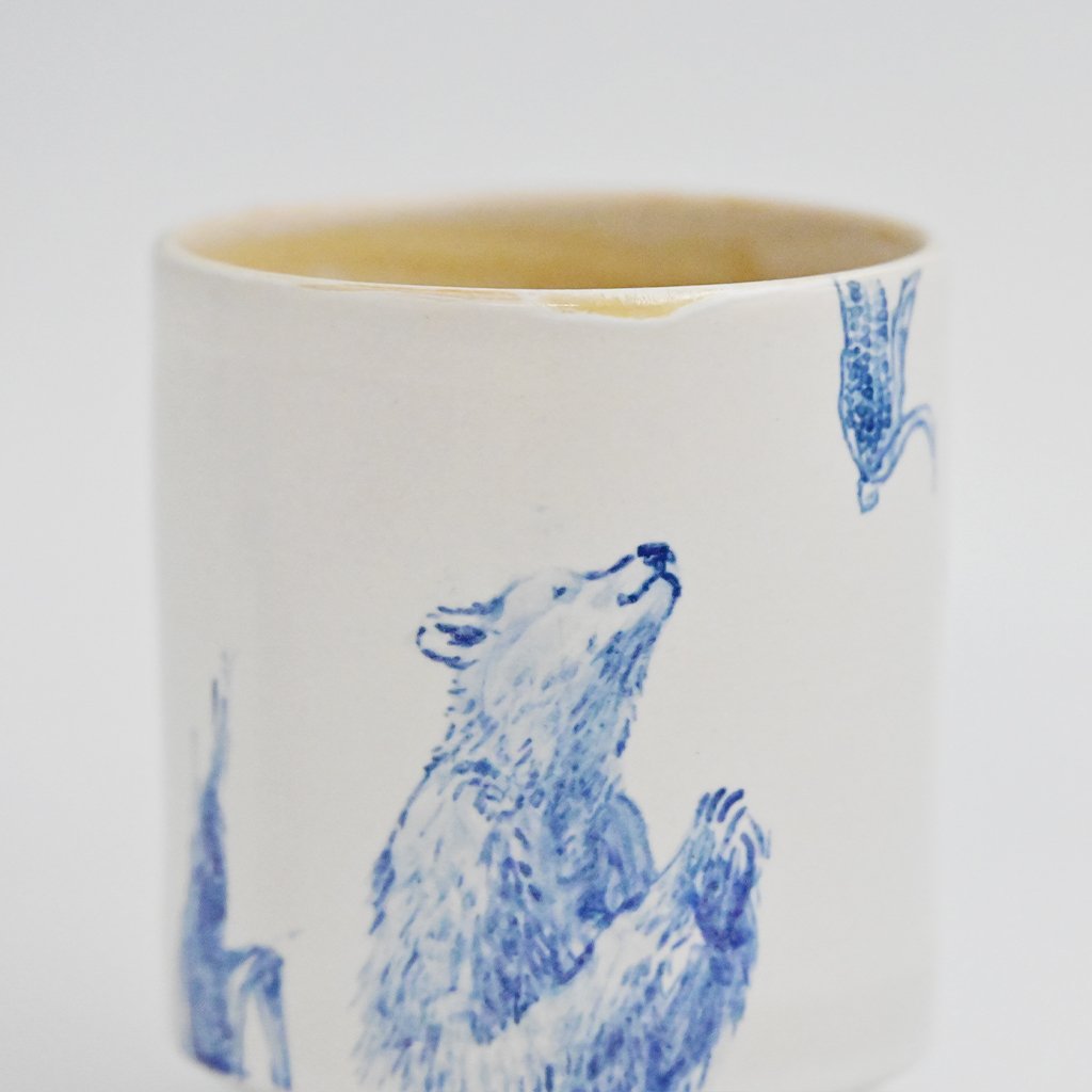 Ručne točená šálka bez uška zo svetlej kameniny upravená kombináciou polomatnej krémovej a lesklej bielej glazúry. Modrý dekor je zdobený technikou majoliky do surovej bielej glazúry pred finálnym, druhým výpalom na 1240°C. Vďaka výpalu pri vysokej teplote je vhodná aj do umývačky riadu.