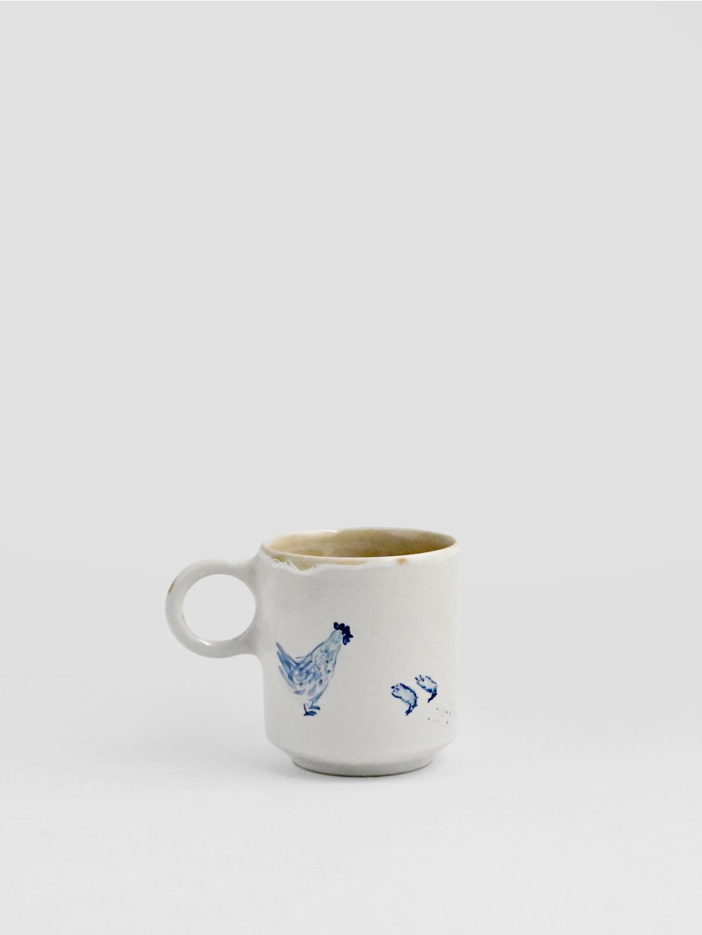 Ručne točená šálka zo svetlej kameniny upravená kombináciou polomatnej krémovej a lesklej bielej glazúry. Modrý dekor je zdobený technikou majoliky do surovej bielej glazúry pred finálnym, druhým výpalom na 1240°C. Vďaka výpalu pri vysokej teplote je vhodná aj do umývačky riadu.