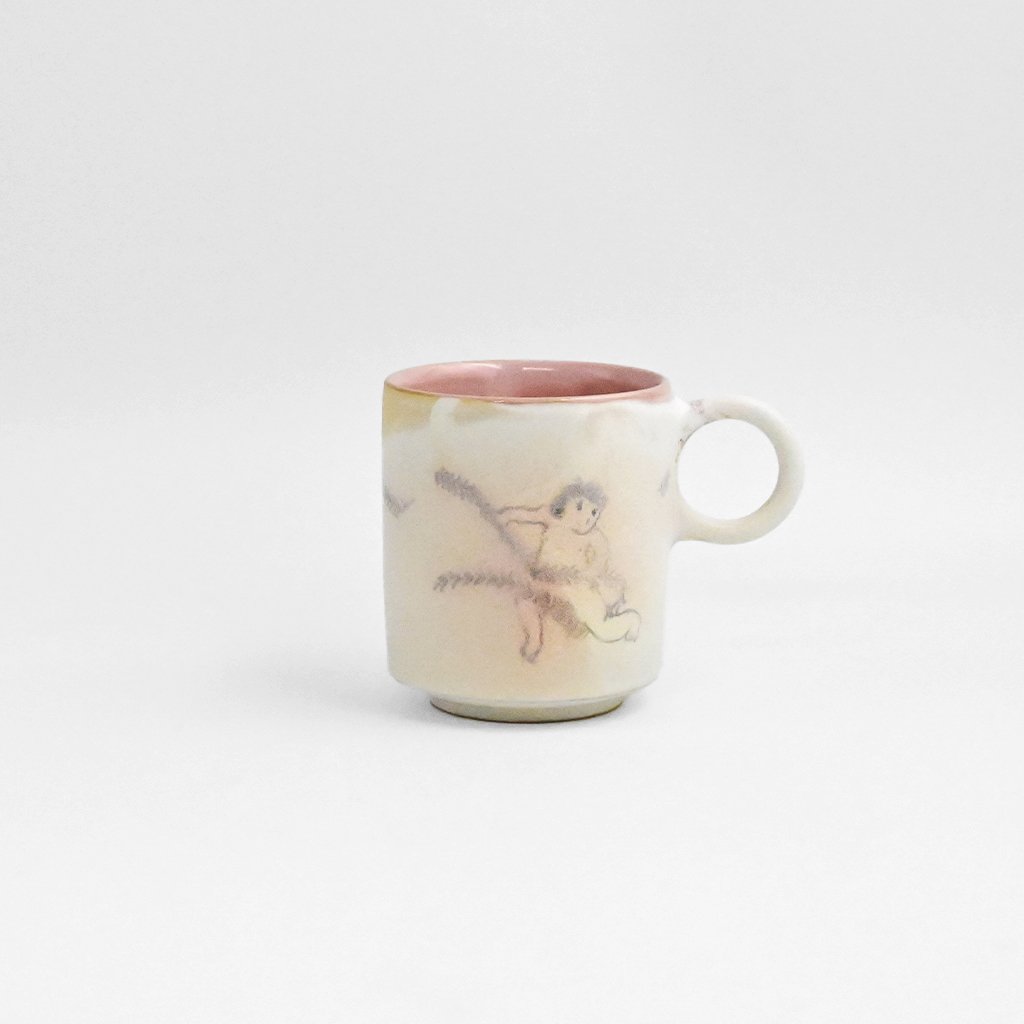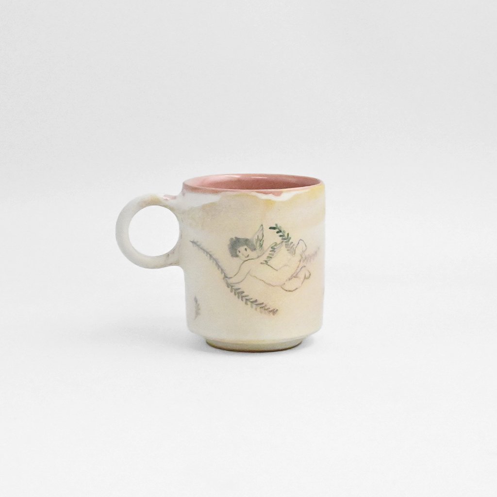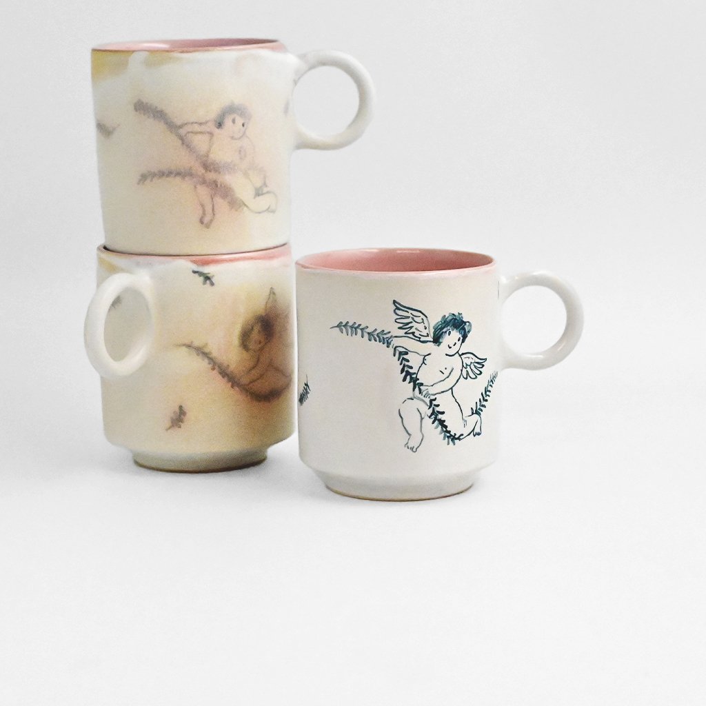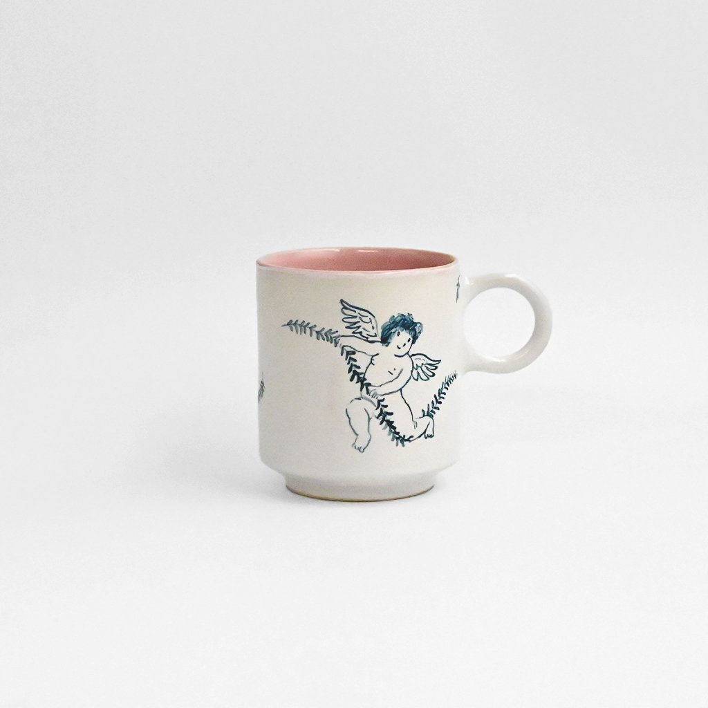 Ručne točená šálka zo svetlej kameniny upravená kombináciou ružovej a bielej efektnej glazúry. Motív anjelikov je zdobený technikou majoliky modrou farbou do surovej bielej glazúry pred finálnym, druhým výpalom na 1240°C. Vďaka výpalu pri vysokej teplote je vhodná aj do umývačky riadu.