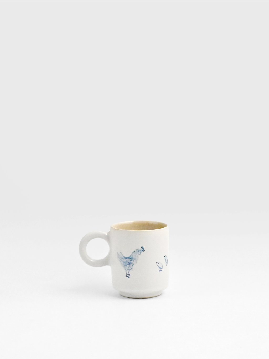 Ručne točená šálka zo svetlej kameniny upravená kombináciou polomatnej krémovej a lesklej bielej glazúry. Modrý dekor je zdobený technikou majoliky do surovej bielej glazúry pred finálnym, druhým výpalom na 1240°C. Vďaka výpalu pri vysokej teplote je vhodná aj do umývačky riadu.